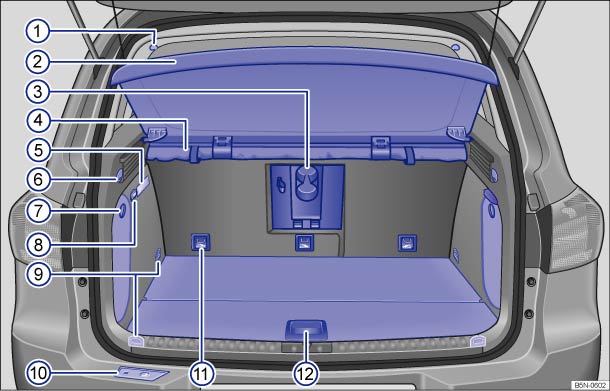Abb. 11 Übersicht des Gepäckraums. Die Positionen ①, ⑥, ⑦, ⑨ und ⑪ sind an der gleichen Stelle auch auf der rechten Fahrzeugseite vorhanden.